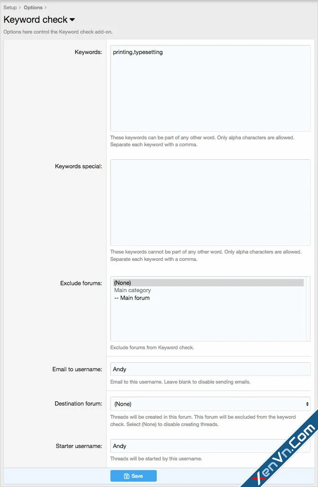 The add-on can send an email to a staff member and or create a new thread alerting staff members of keywords in a post.