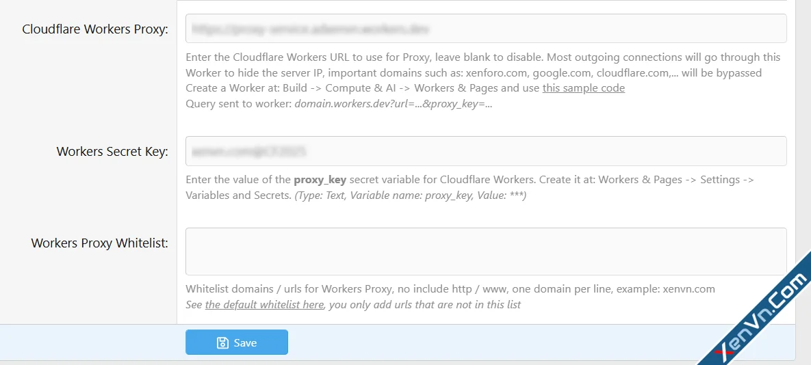 You can add other domains yourself if needed in the Workers Proxy Whitelist field.xenvn.com